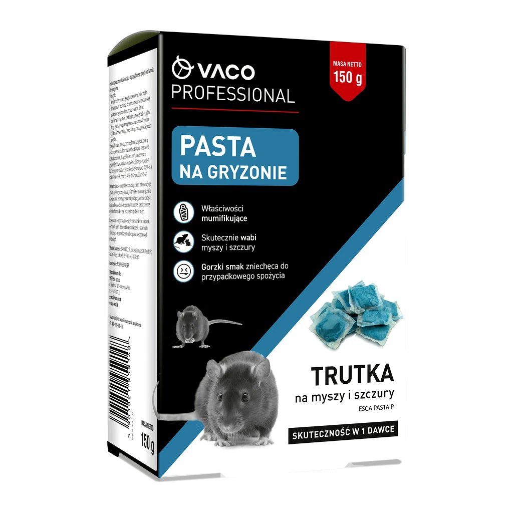 Pasta VACO PROFESSIONAL to niezawodny sojusznik w walce z gryzoniami, który działa szybko i skutecznie. Jeśli masz do czynienia z uciążliwymi szkodnikami, jak szczury wędrowne, szczury śniade czy myszy, nasz produkt zapewni Ci pewną eliminację.