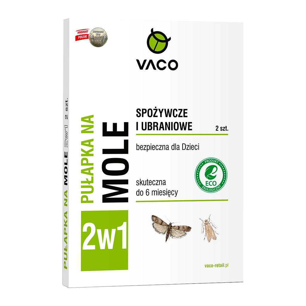 Pułapka na mole kuchenne i odzieżowe marki VACO zapewnia skuteczną ochronę do 6 miesięcy, gwarantując spokój z uciążliwymi molami na pół roku. Pułapka wykorzystuje feromony, aby skutecznie przyciągać mole spożywcze oraz mole ubraniowe, co czyni ją efektywnym narzędziem do zwalczania moli w domu, kuchni oraz miejscach przechowywania żywności i ubrań. Dzięki temu użytkownicy nie muszą martwić się o częstą wymianę pułapki lub dodatkowe interwencje, co zapewnia długotrwałe i bezproblemowe użytkowanie. Chroni nawet do 50 m² na 1 szt. – 2 sztuki w zestawie to 100 m²